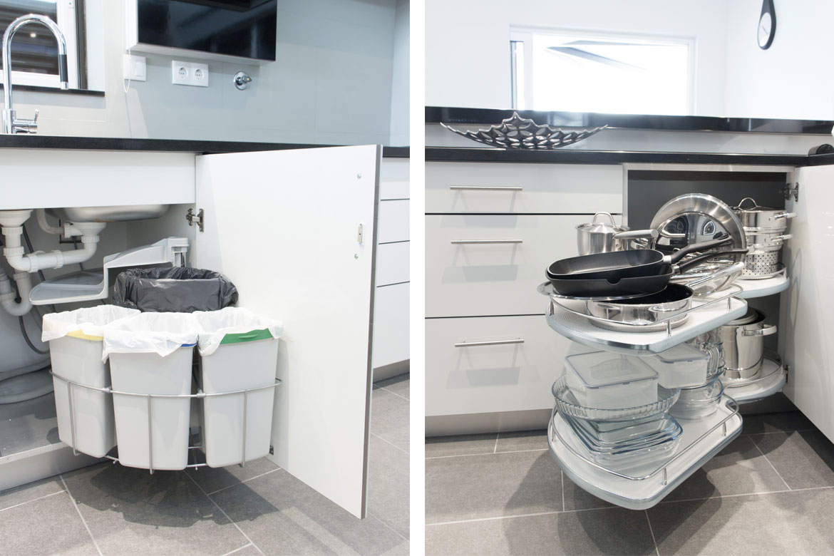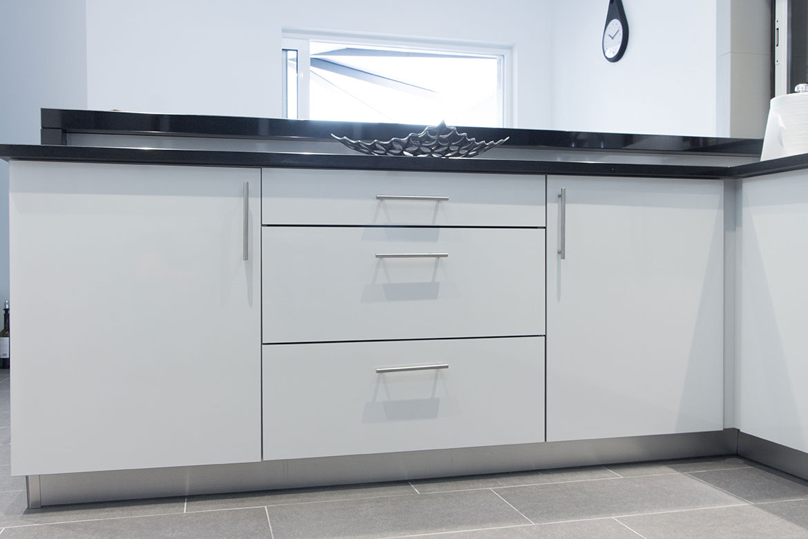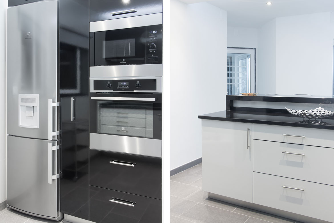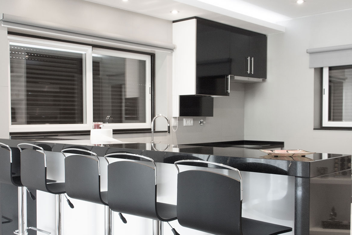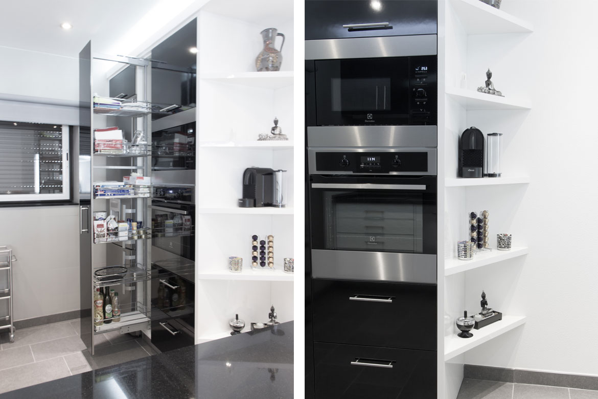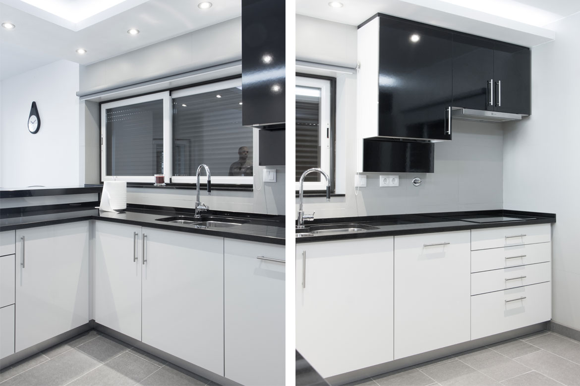 Cozinha em termolaminado branco e preto brilho com tampo em preto absoluto.