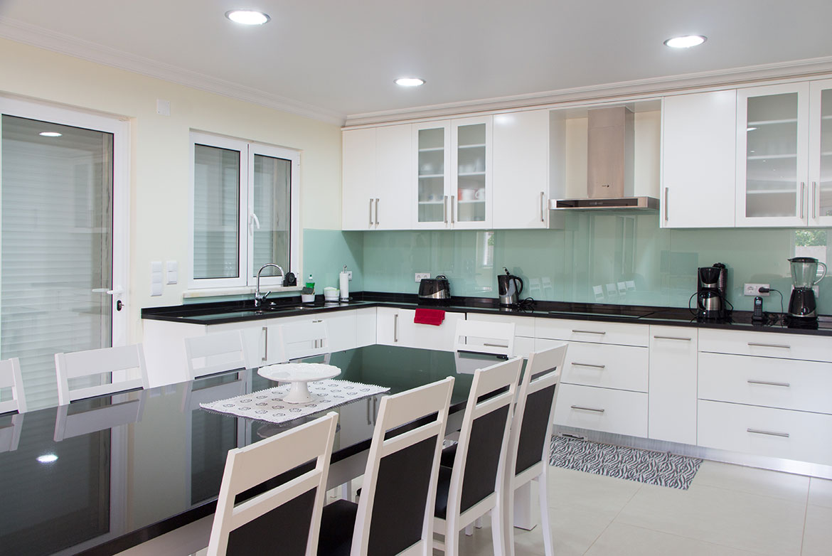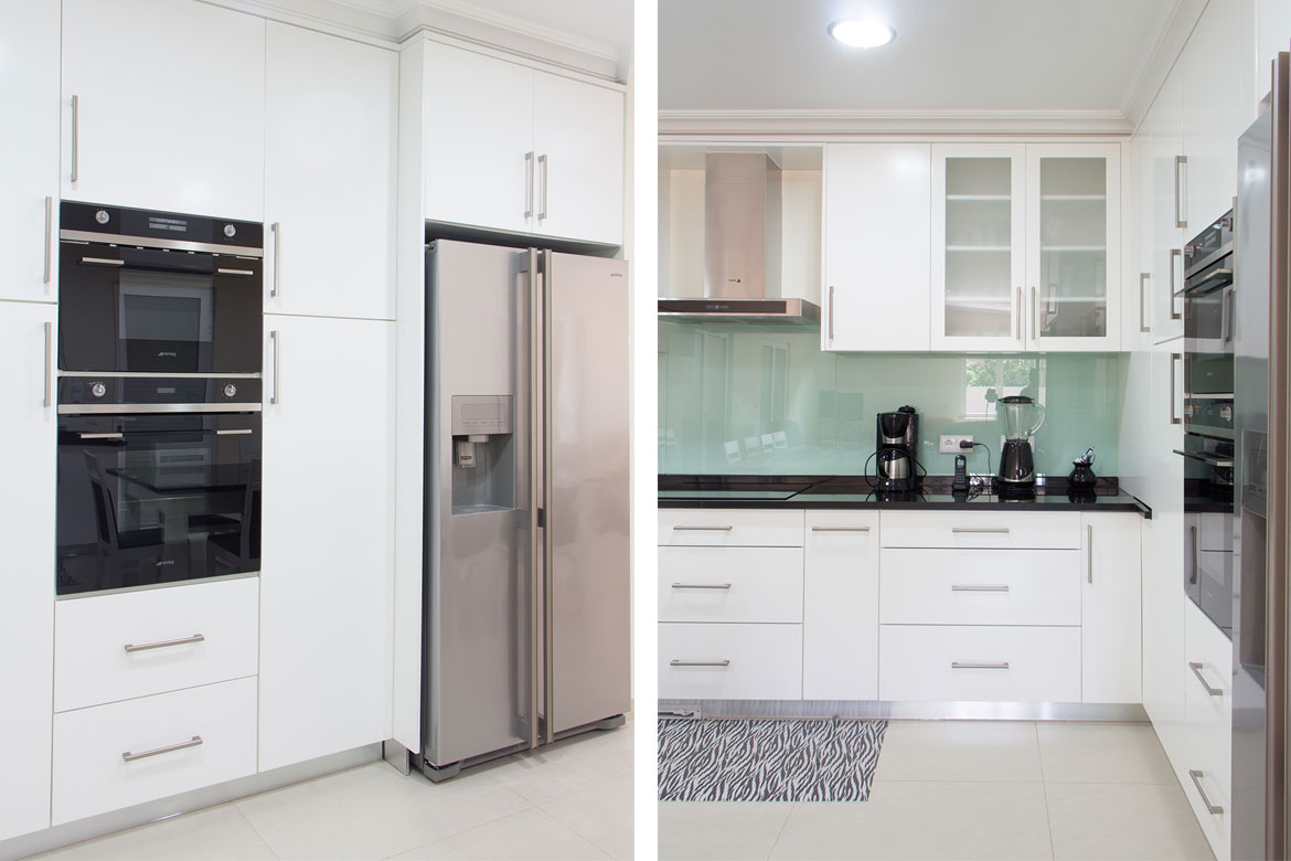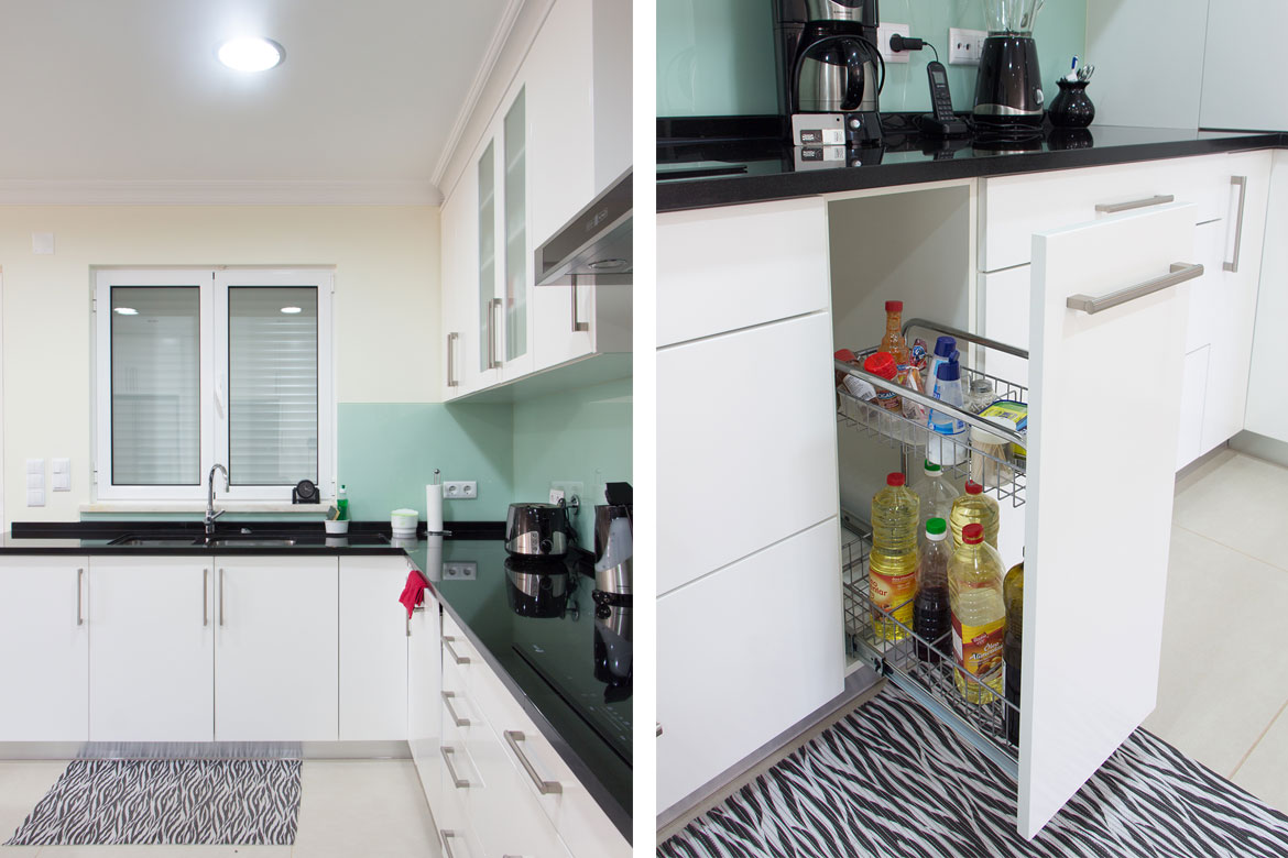 Cozinha em MDf hidrófugo lacada a branco 1/2 brilho com tampo em preto absoluto.