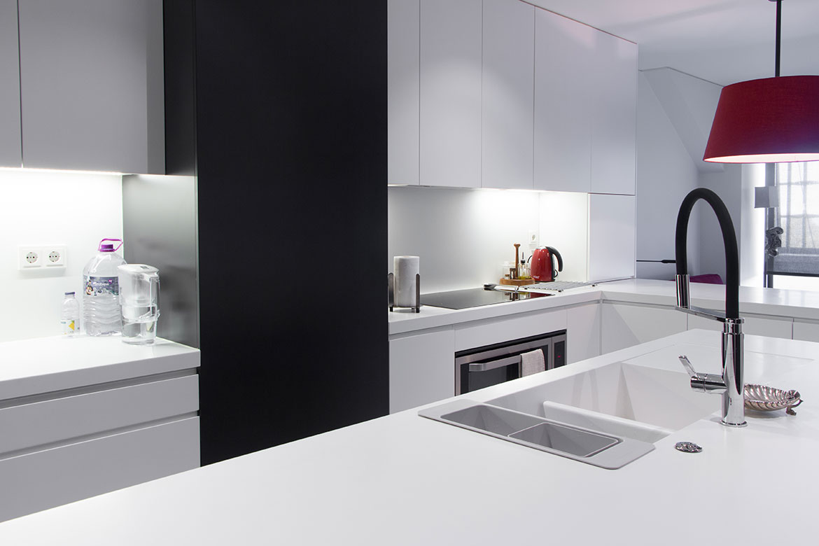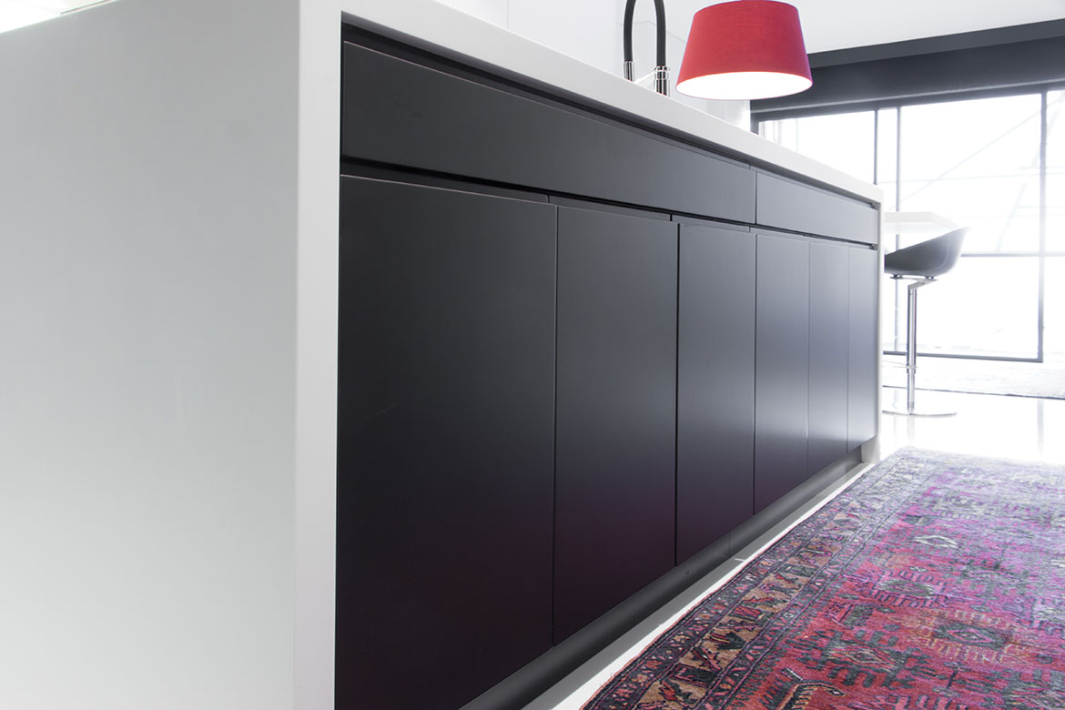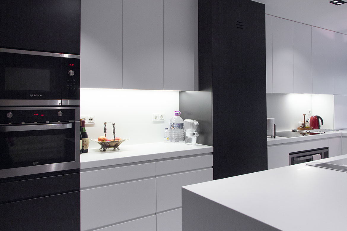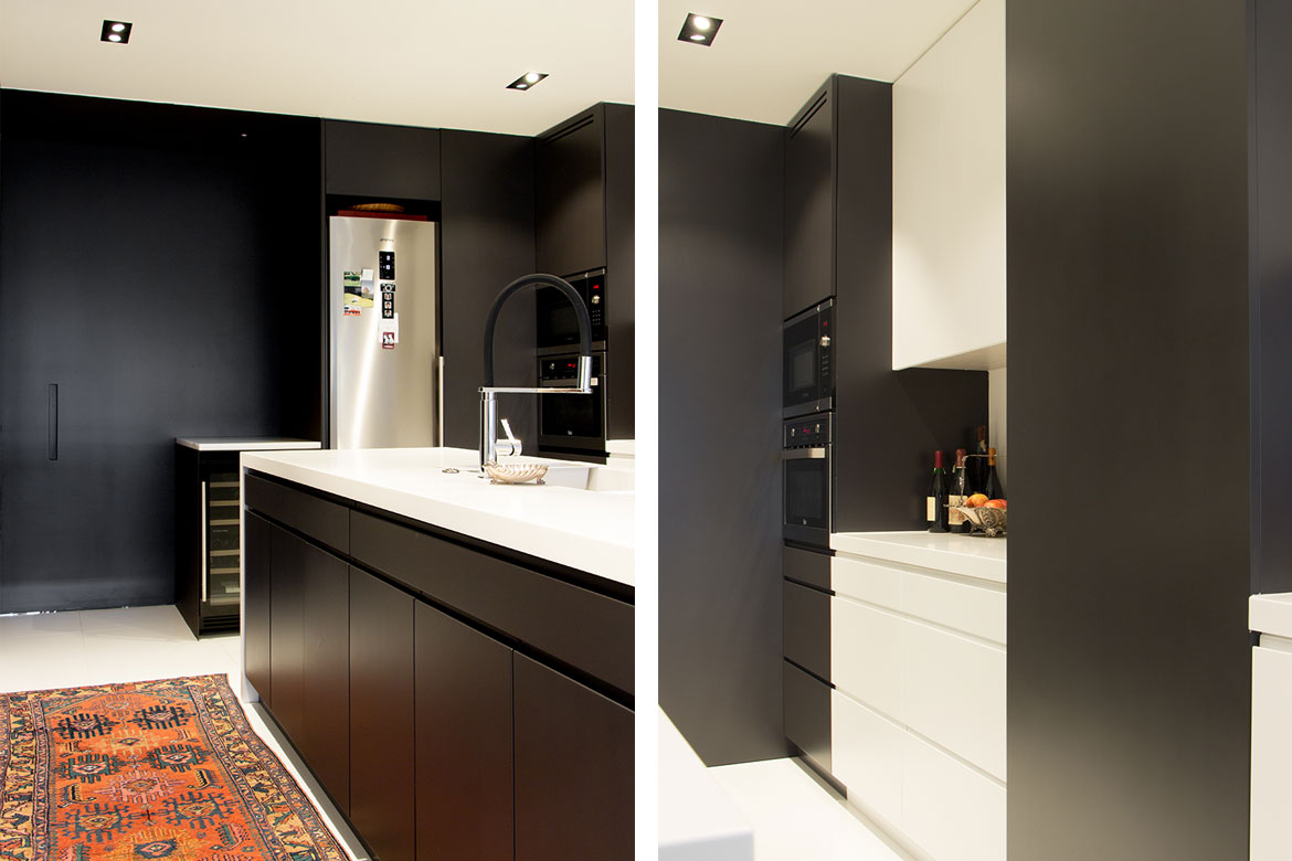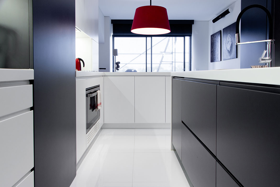 Cozinha em MDf hidrófugo, lacado a 2 cores, branco e preto, com puxadores escavados nas frentes.