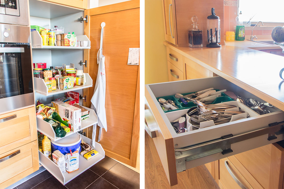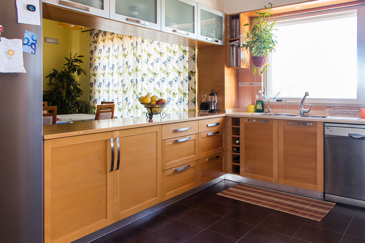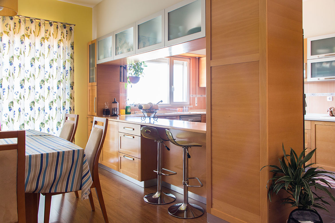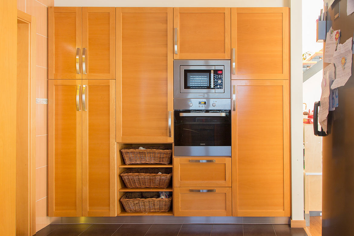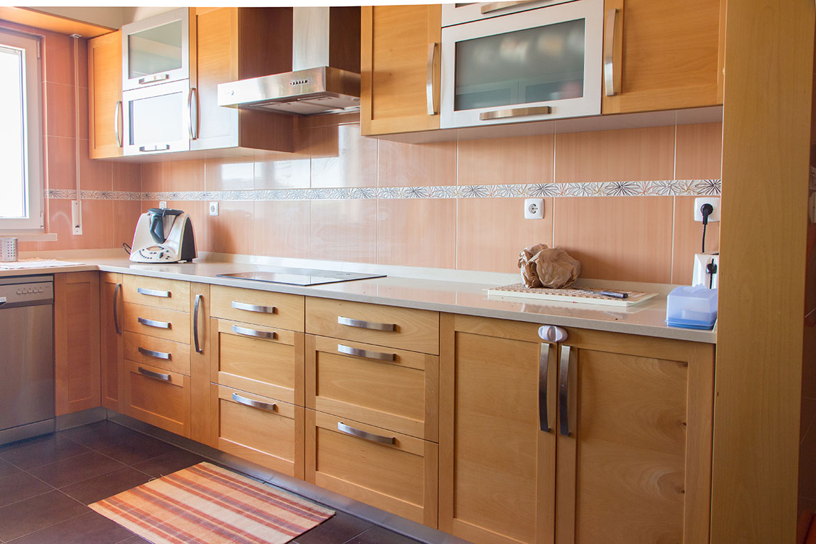 Cozinha com aro de faia e almofada lisa em MDF hidrófugo, folheada a faia com tampo em Compac Arena