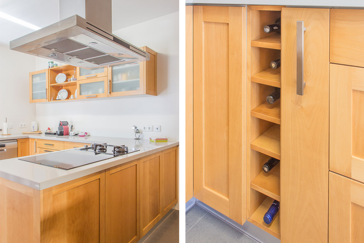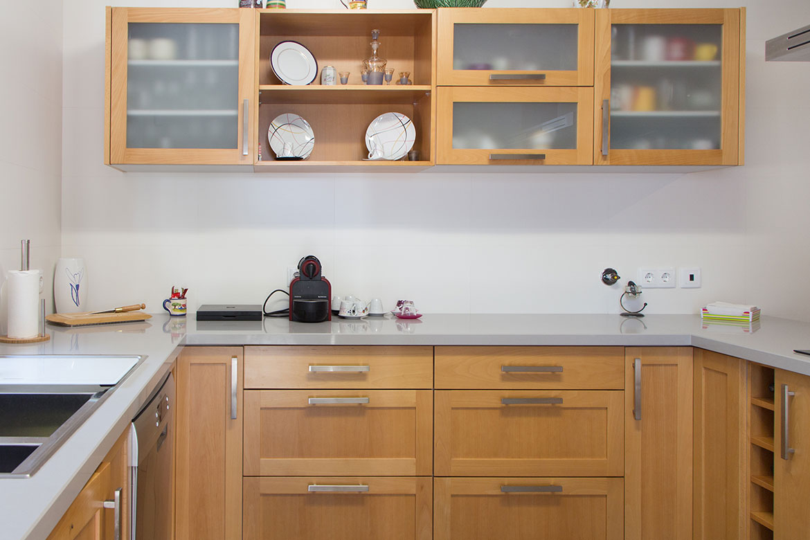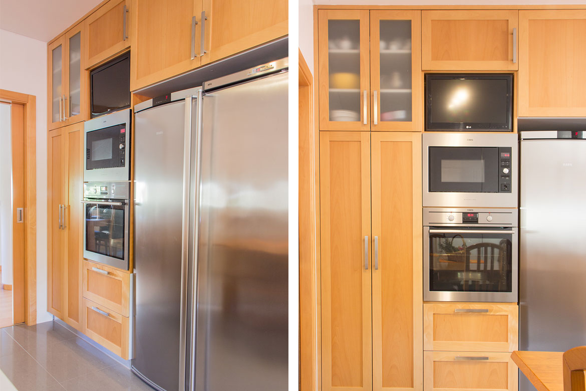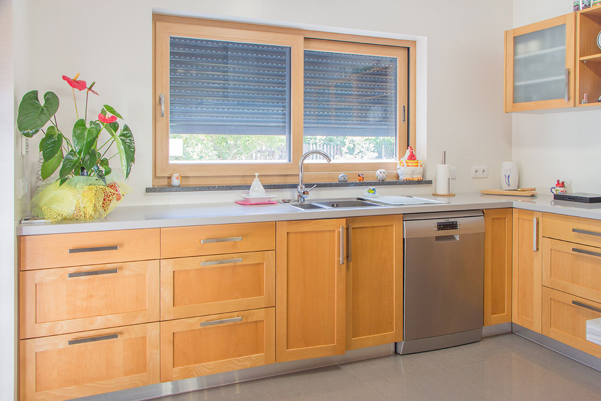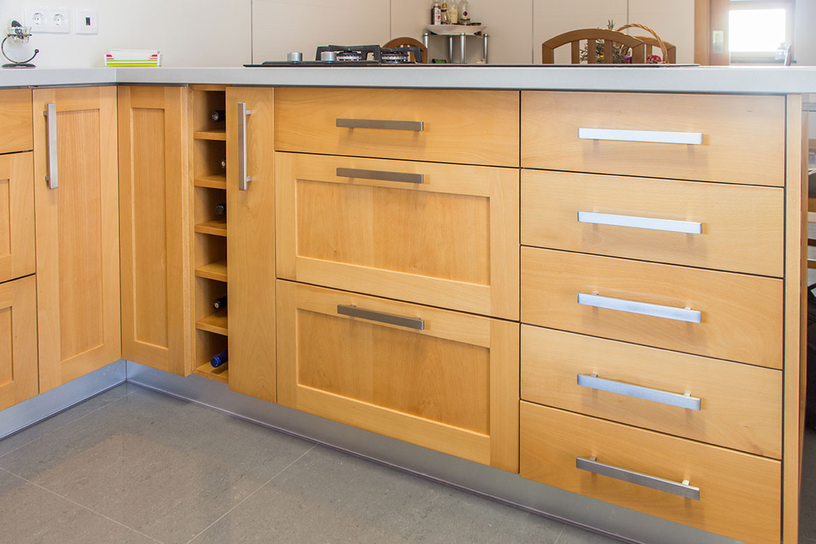 Cozinha com portas com aro de madeira maciça de carvalho com almofada lisa em MDf hirófugo folheado a carvalho.