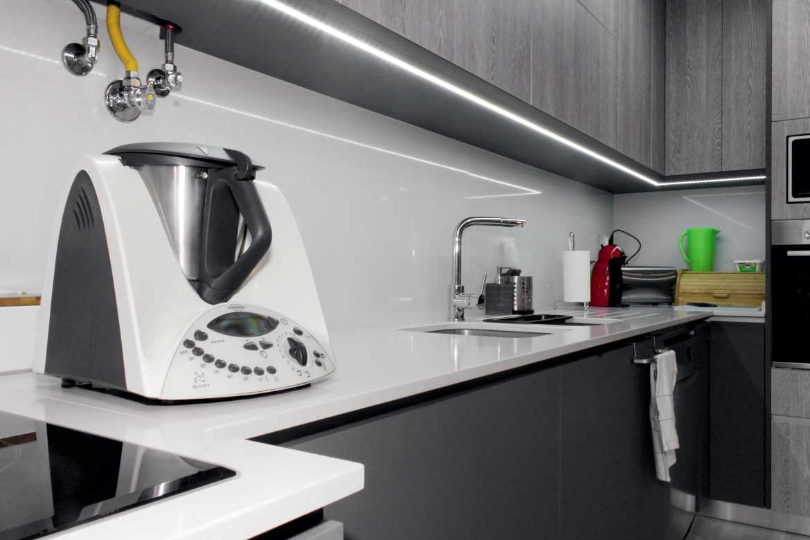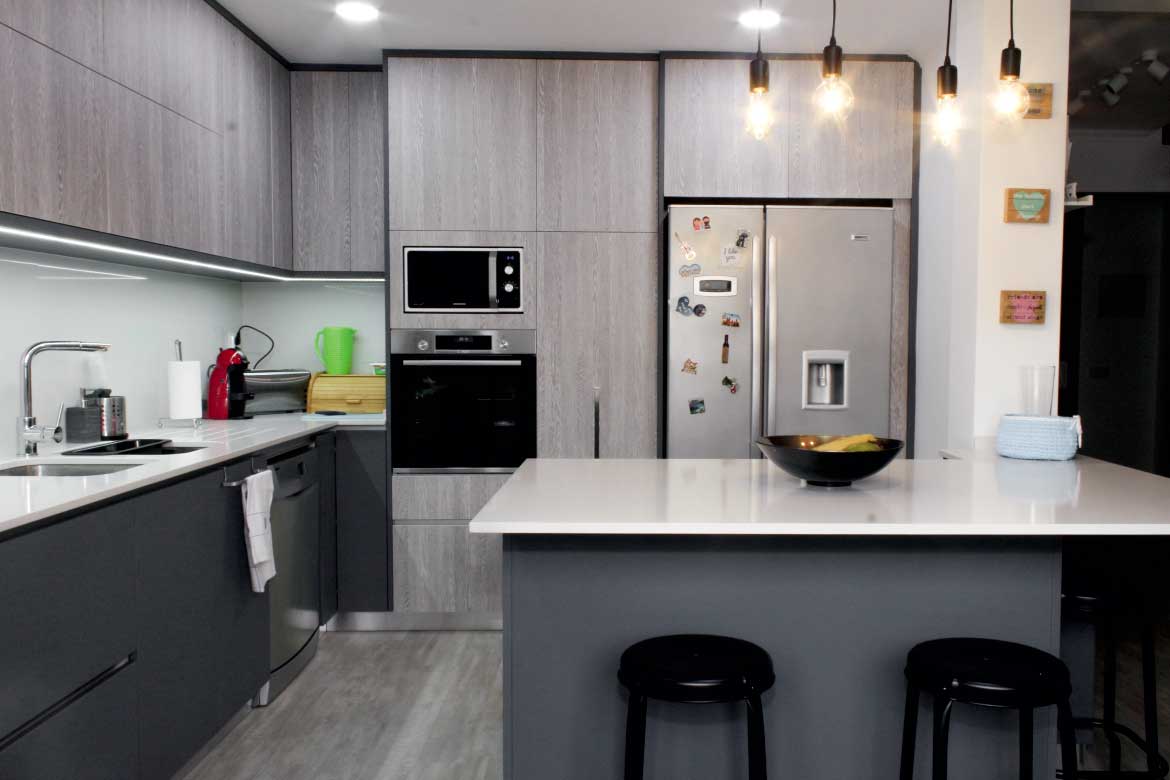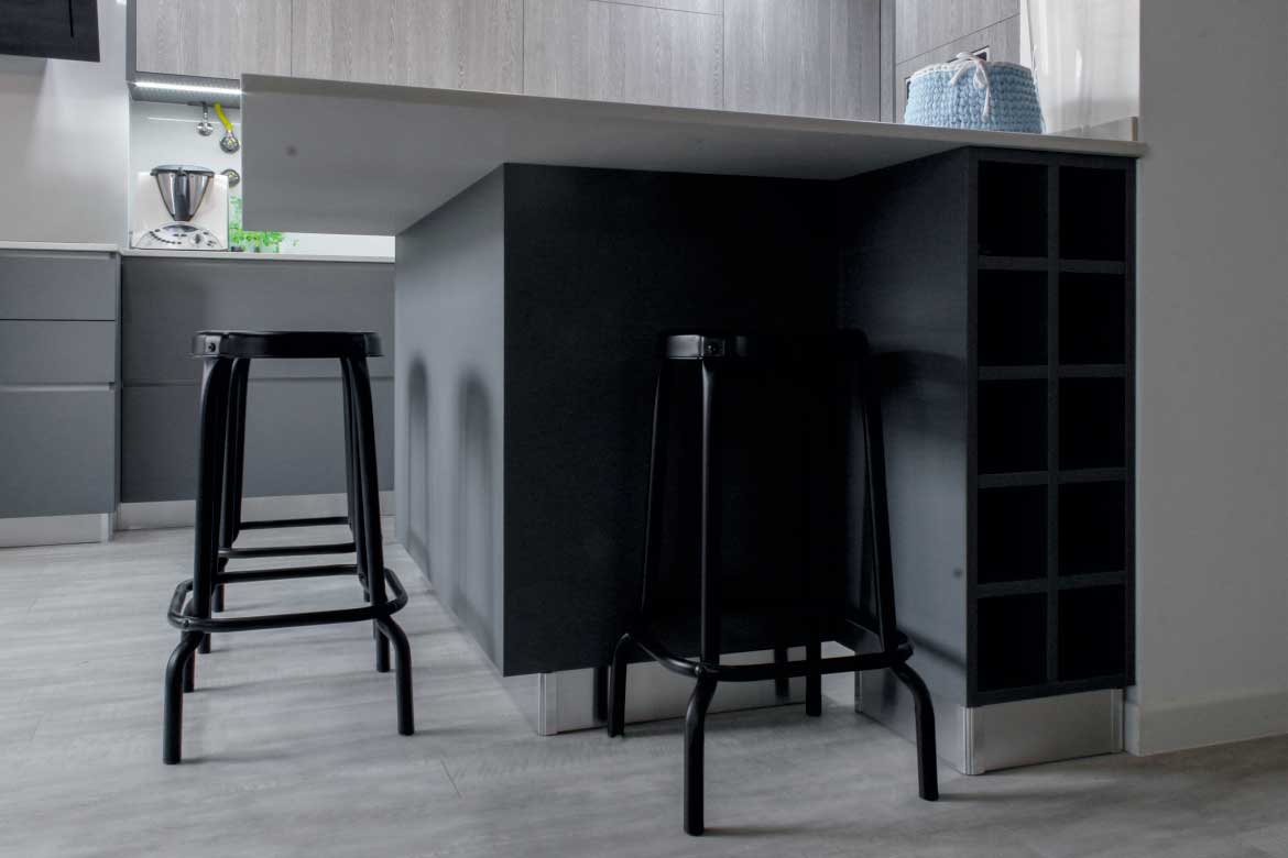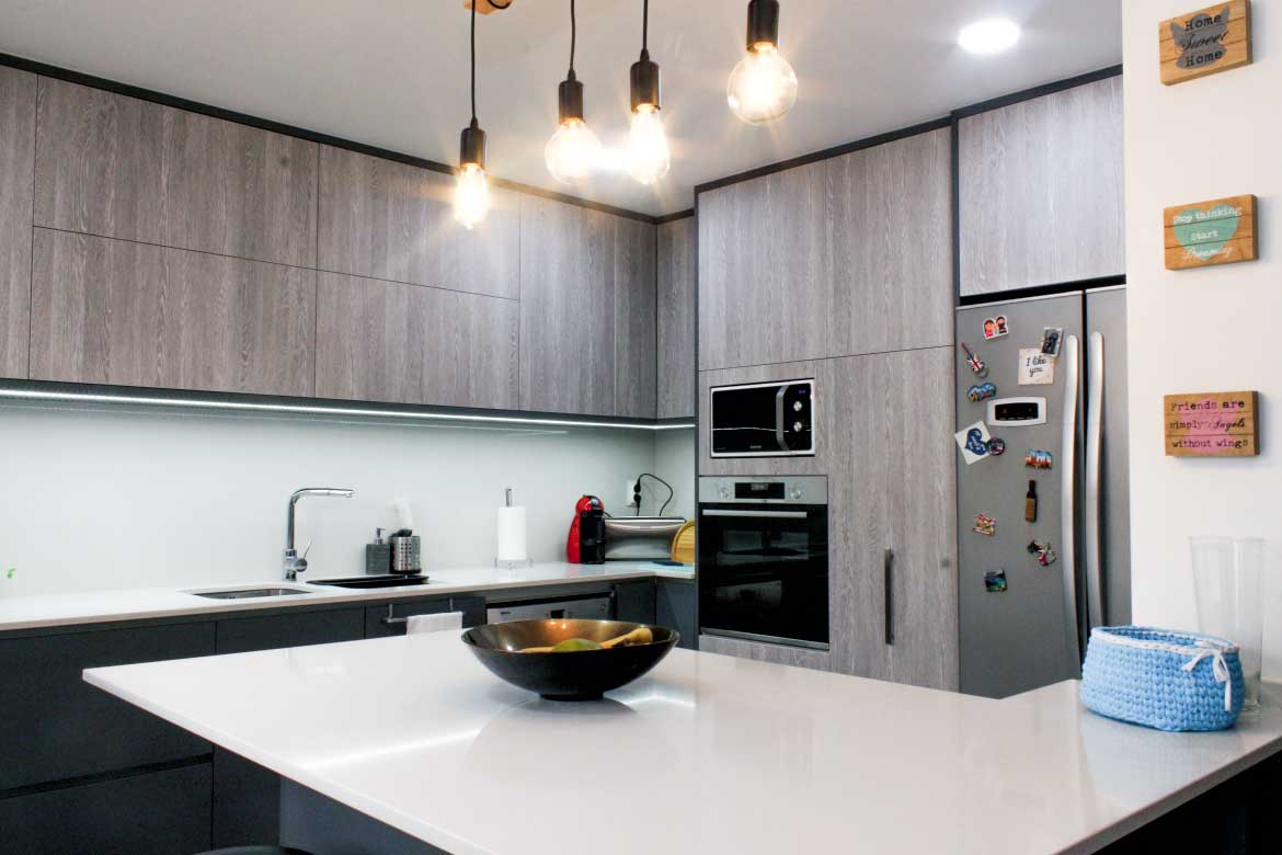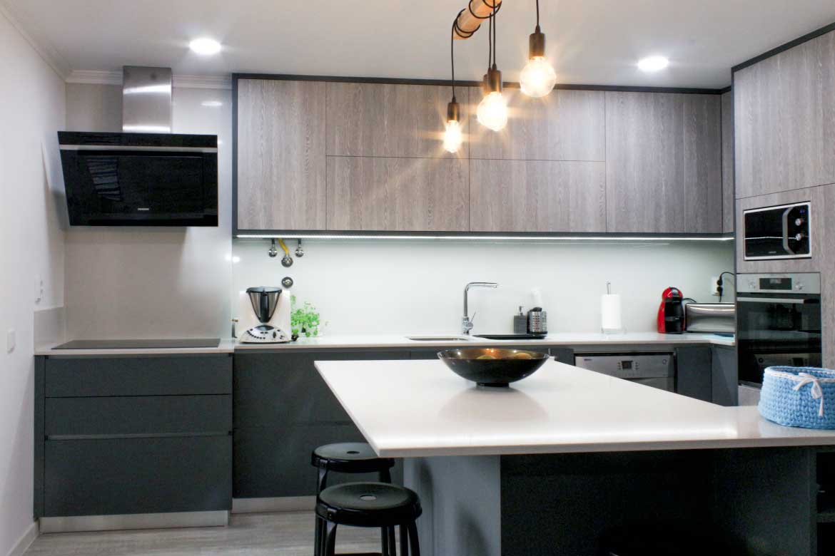 Executada em termolaminado liso G076 Touch e termolaminado a imitar madeira em tons cinza W009 exm. Tampo em Quartz Compac referência Luna a 2 cm espessura.