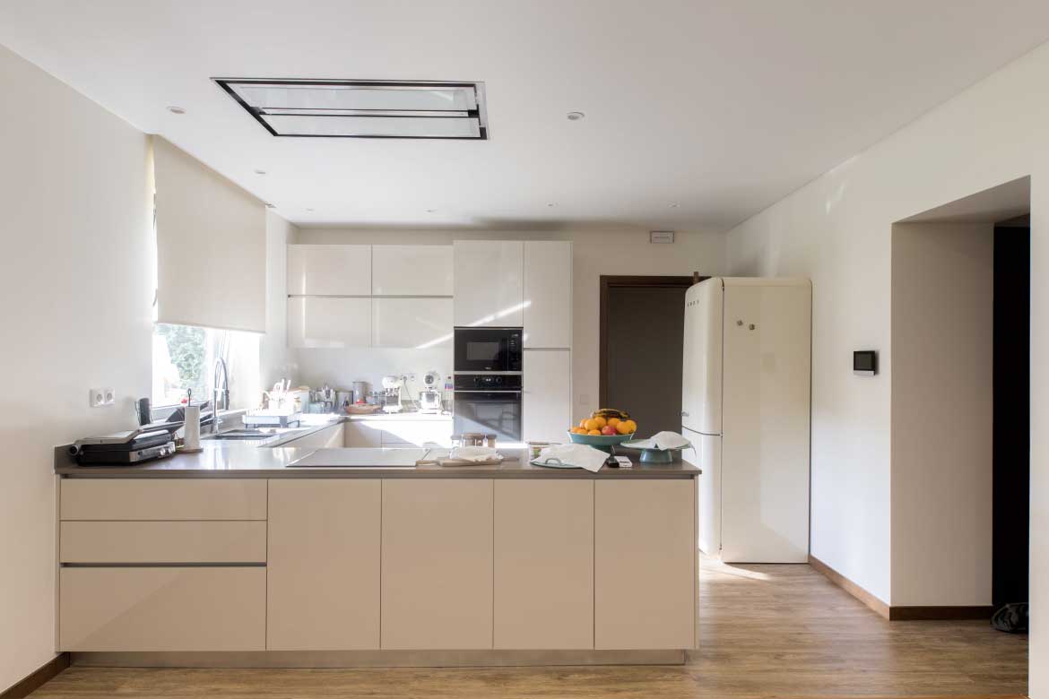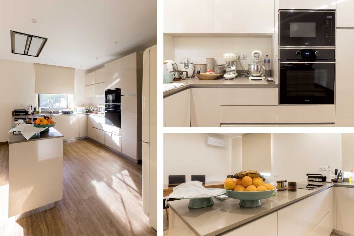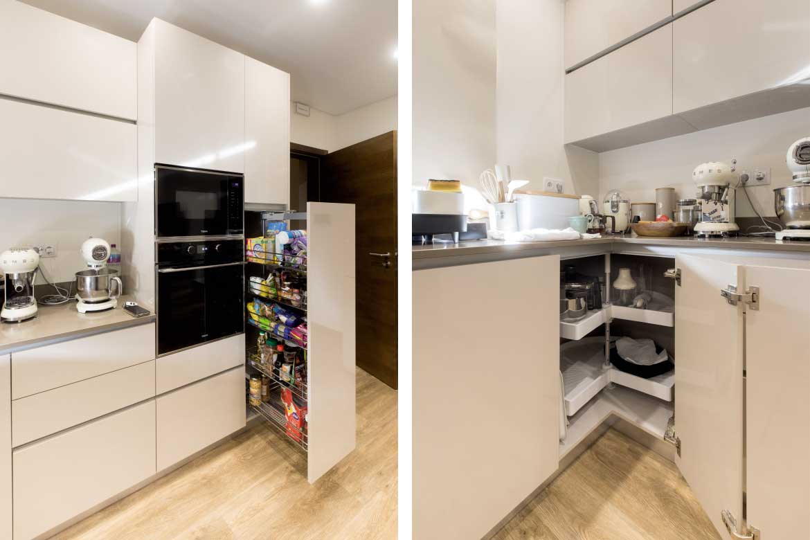 Executada em termolaminado B116 brilho com canto 3/4 em PVC e despenseiro cromado aramado Saphir da Vauth-Sagel. Tampo em Silestone referência Noka a 2 cm espessura.