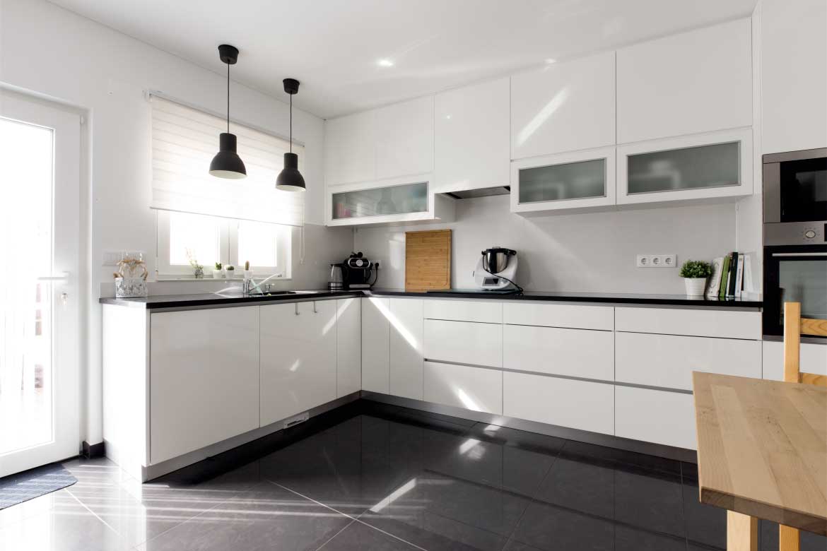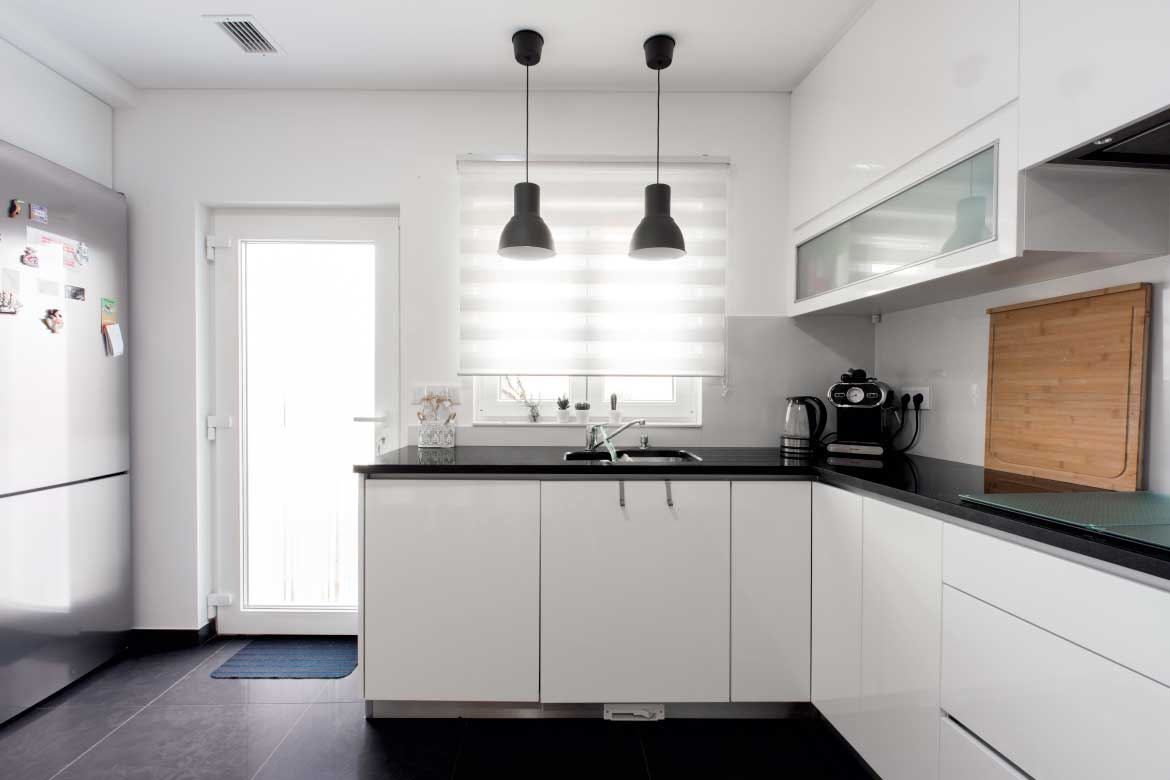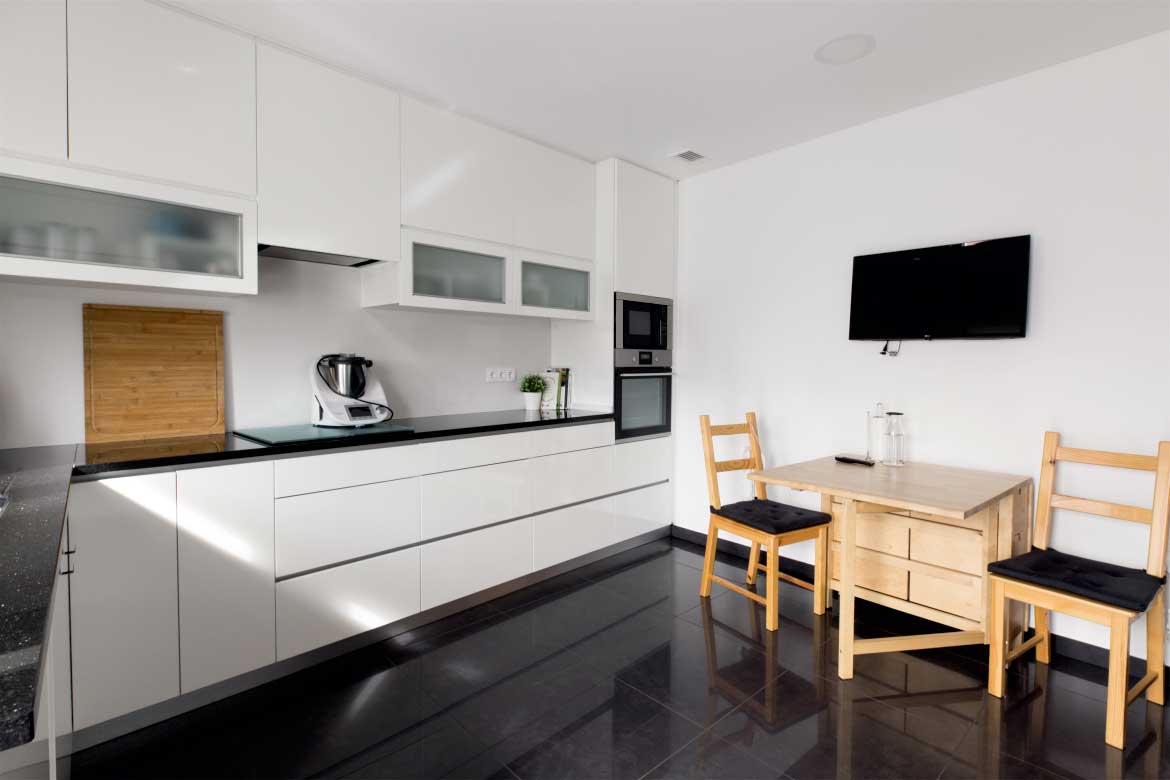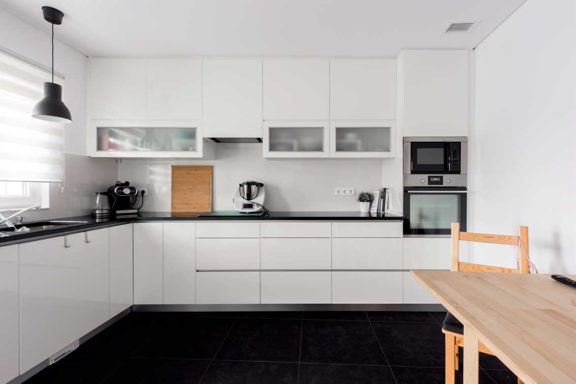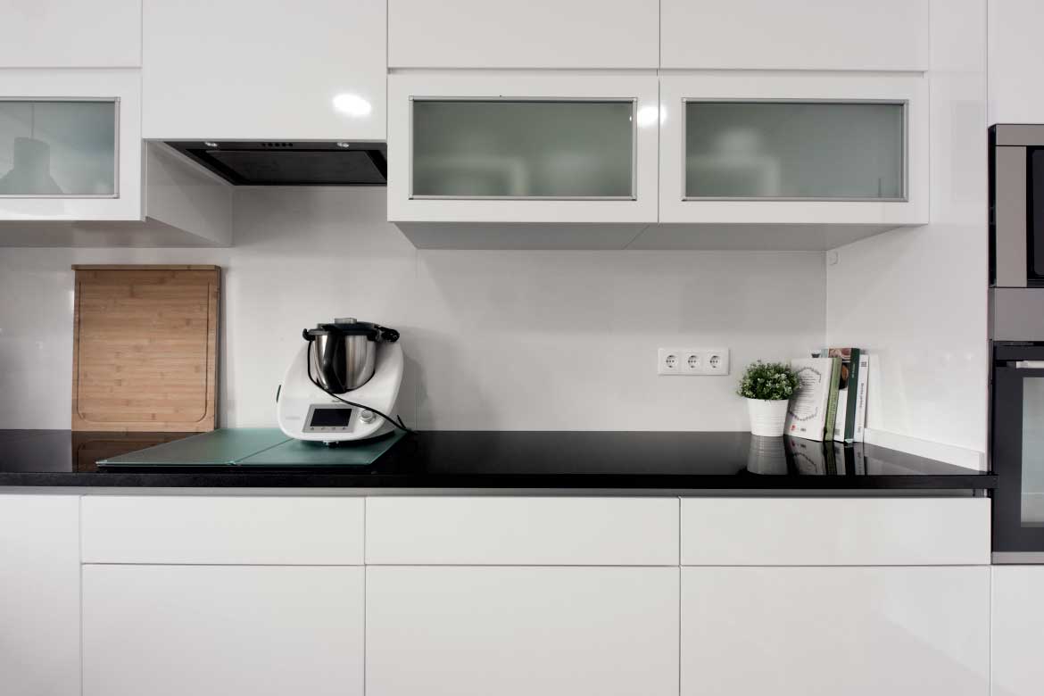 Executada em termolaminado B070 brilho. Tampo em granito Preto Angola com 2 cm espessura.