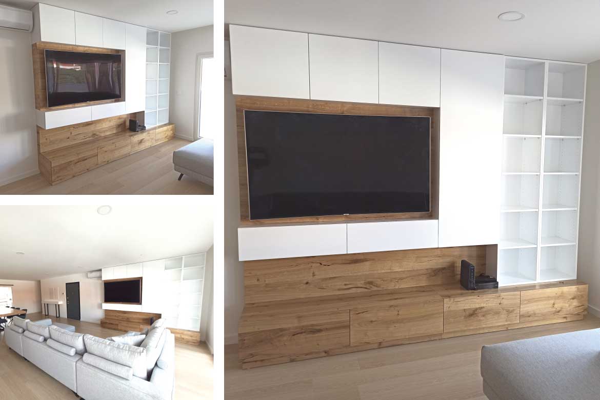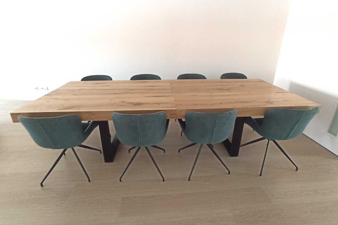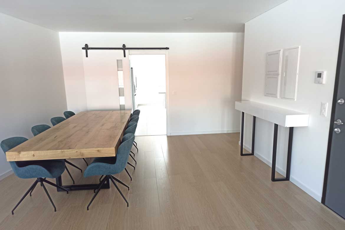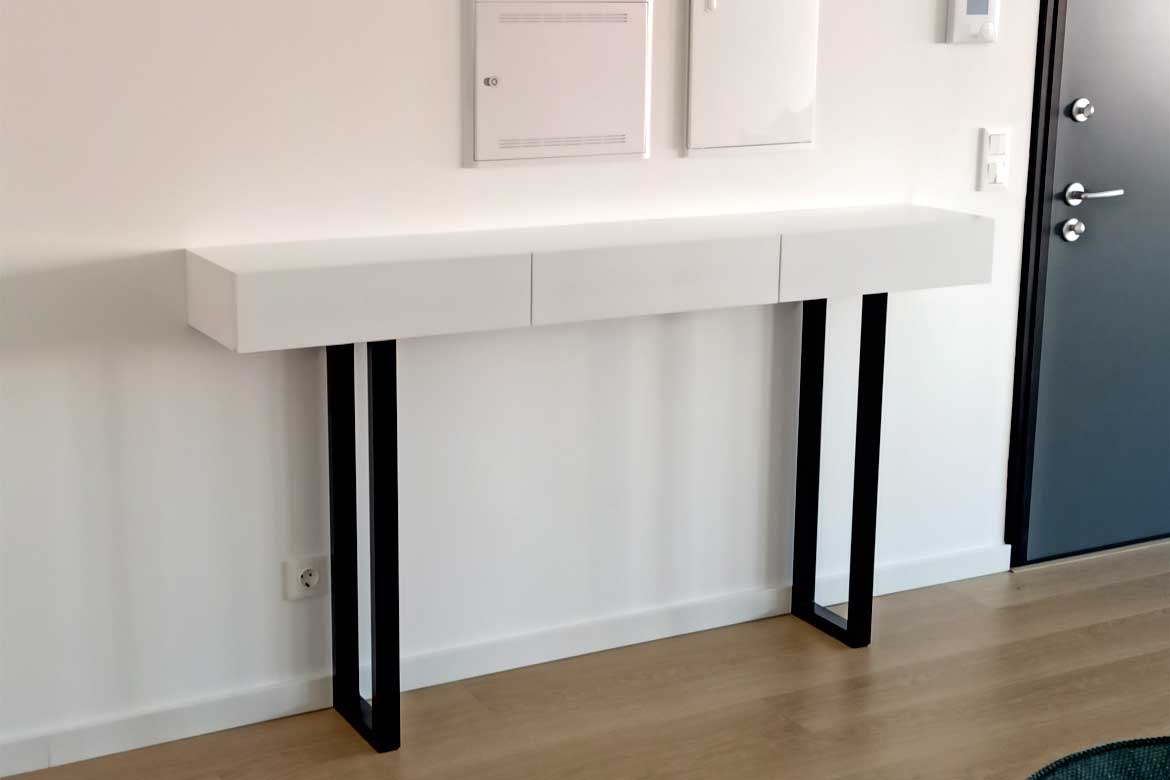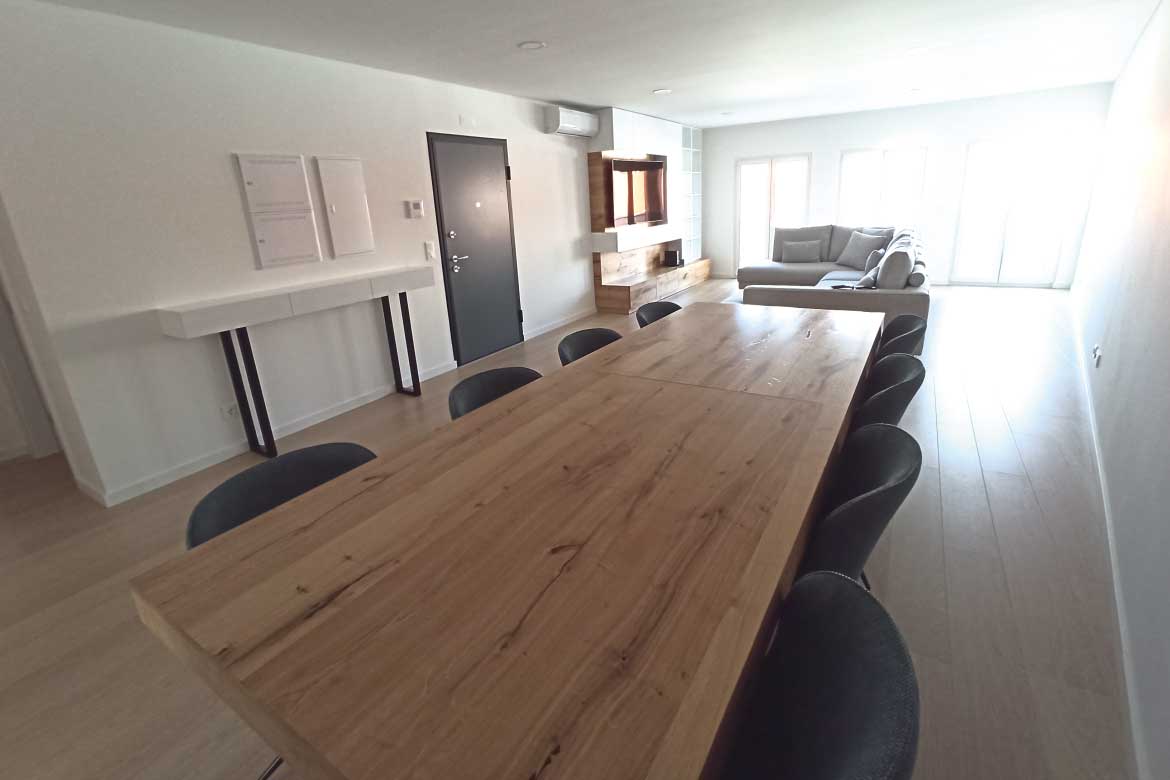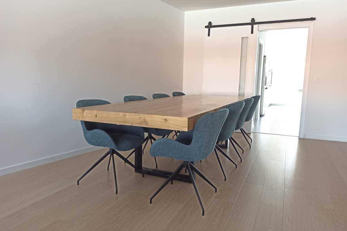 Mesa e aparador executados em contraplacado marítimo de bétula folheado a Cracked Oak com acabamento a verniz e MDF hidrófugo lacado a branco meio brilho.