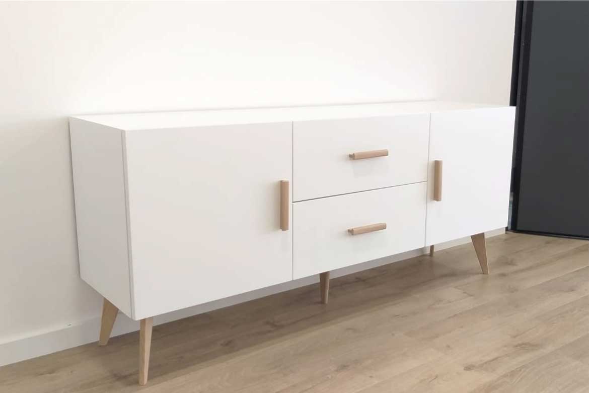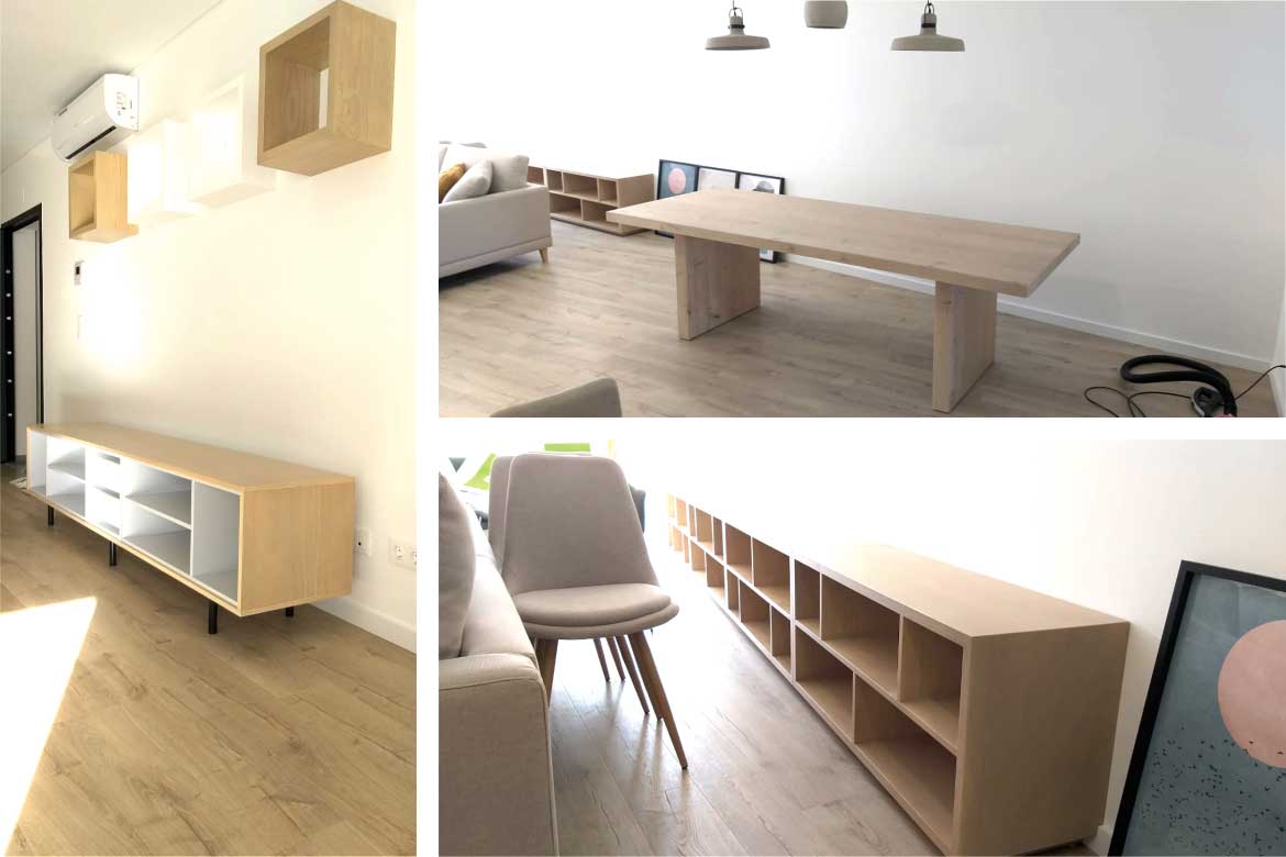 Móveis executados em contraplacado marítimo de bétula folheado a pinho com acabamento a velatura creme e verniz e MDF hidrófugo lacado a branco mate; Mesa em madeira maciça de casquinha com acabamento a velatura creme e verniz.