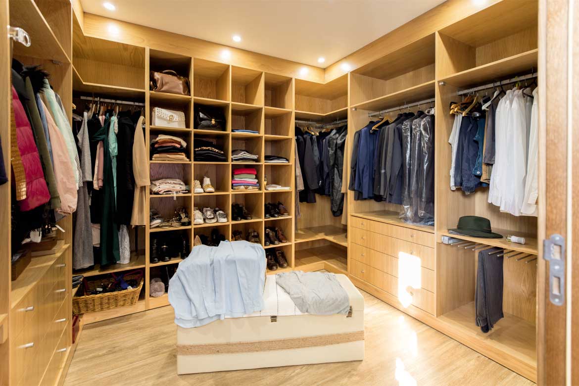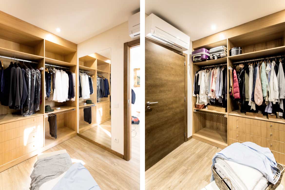 Roupeiro em contraplacado marítimo de bétula folheado a carvalho com acabamento a verniz poliuretano.
