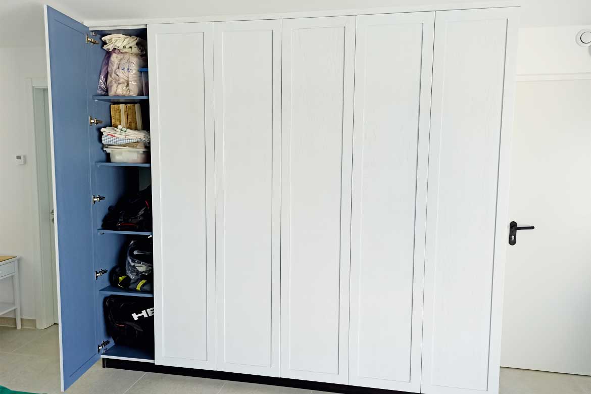 Executado em contraplacado marítimo de bétula folheado a carvalho com acabamento a verniz acrílico em cor mais clara no exterior e mais escura no interior. Prateleiras em termolaminado Baltic Sea D475-60 mate.